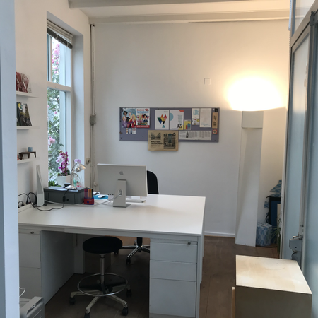 Al meer dan tien jaar huurden wij met meerdere creatieven een kantoorruimte op de Brigittenstraat in Utrecht. Aangezien er zo nu en dan mensen weggingen, waren er interne verhuizingen. Zo ben ik in 2019 naar de 'hoek' verhuisd. Ik heb het bestaande bureau afgebroken en de indeling veranderd d.m.v. nieuwe kasten en tafels. Het is werd een heerlijke ruim ogende werkplek, met ruimte voor twee bureaus.